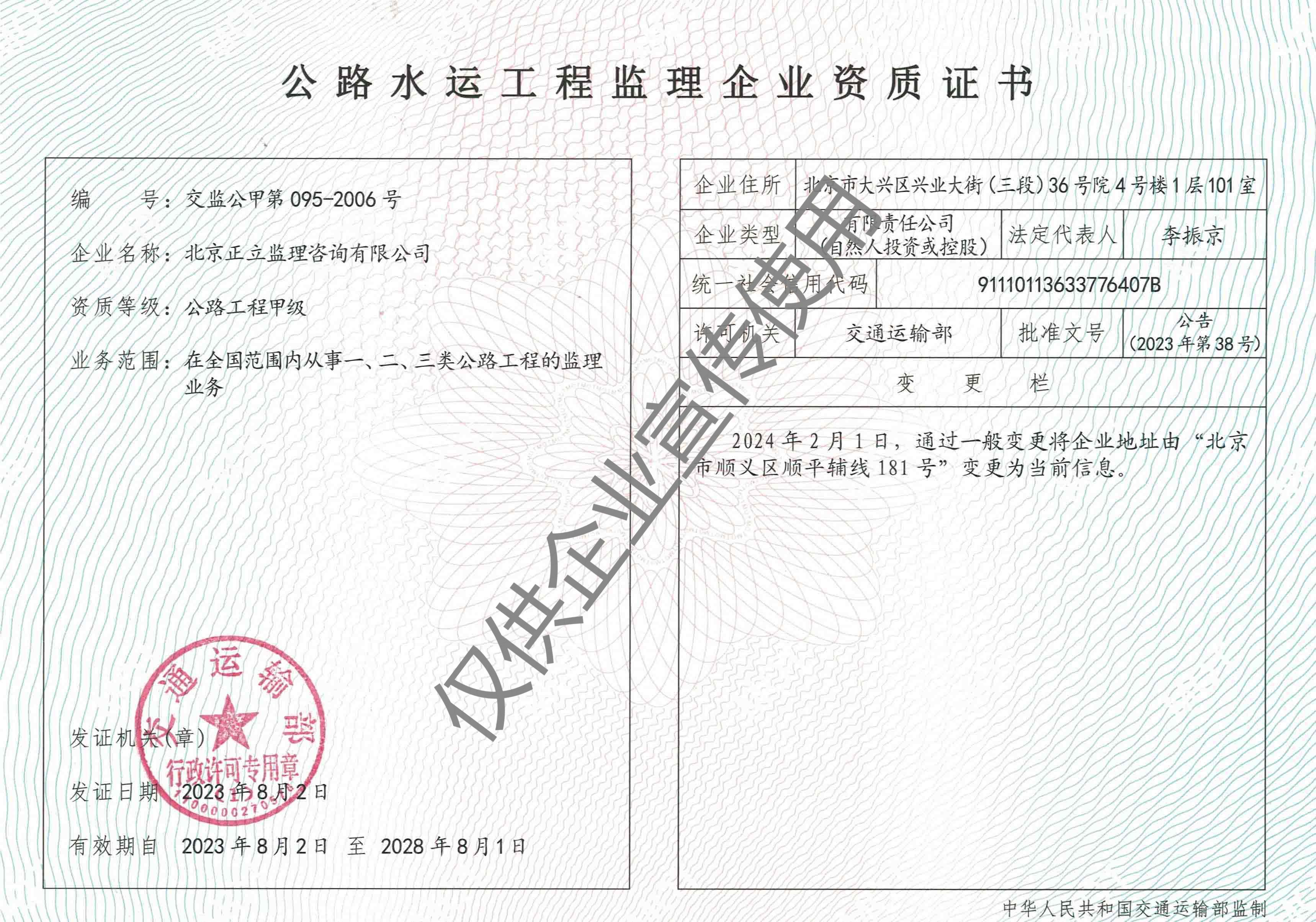 公司現(xiàn)為中國交通建設監(jiān)理協(xié)會理事單位,持有交通運輸部公路工程甲級資質(zhì)、房屋建筑工程乙級資質(zhì)、市政公用工程乙級資質(zhì)、綜合檢測乙級資質(zhì)。能夠承擔高等級公路、大型橋梁、隧道工程、房建市政的施工監(jiān)理及技術(shù)咨詢服務。